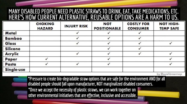 When the issue of banning single-use plastic straws in certain cities became a mainstream topic, it was revered by many; seen by most as a positive change, a step in the right direction. However, that point of view comes from a place of privilege that lacks the consideration of all involved. Having privilege isn’t something to feel bad about but keep in mind it largely affects your view on point of view; your view of the world is created by your experiences. Like in my case, I knew so little about disability and accessibility issues until I became disabled myself and lived these issues. But if you approach the concept of banning straws from an intersectional point of view, it becomes quite clear that it is not a clear cut. Banning straws is actually quite problematic for the disabled community in particular, not to mention other minorities that may be affected that I’m not cognizant of.